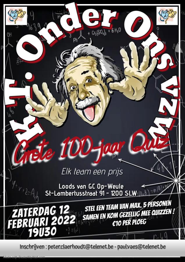 Stel een team samen van maximum 5 personen en kom ons gezellig vervoegen om mee te strijden naar de ereplaats. Het wordt een algemene kennis-quiz. Voor alle gegadigden tussen 7 en 100 jaar, iedereen kan deelnemen !